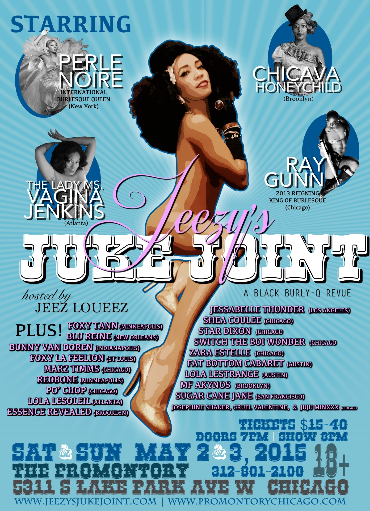 *****TICKETS ON SALE NOW!!!***** SAT- http://promontorychicago.com/?event_id=5592655 SUN- http://promontorychicago.com/?event_id=5700565 *TWO NIGHTS* Saturday May 2nd Sunday May 3rd The Promontory Doors 7pm | Show 8pm 18+ $40 VIP packages available: Front row tickets for this special show include a gift bag, a signed show poster, and a photo with the cast after the show $30 Reserved TableContinue reading “Jeezy’s Juke Joint: A Black Burly-Q Revue May 2-3rd (Chicago)”